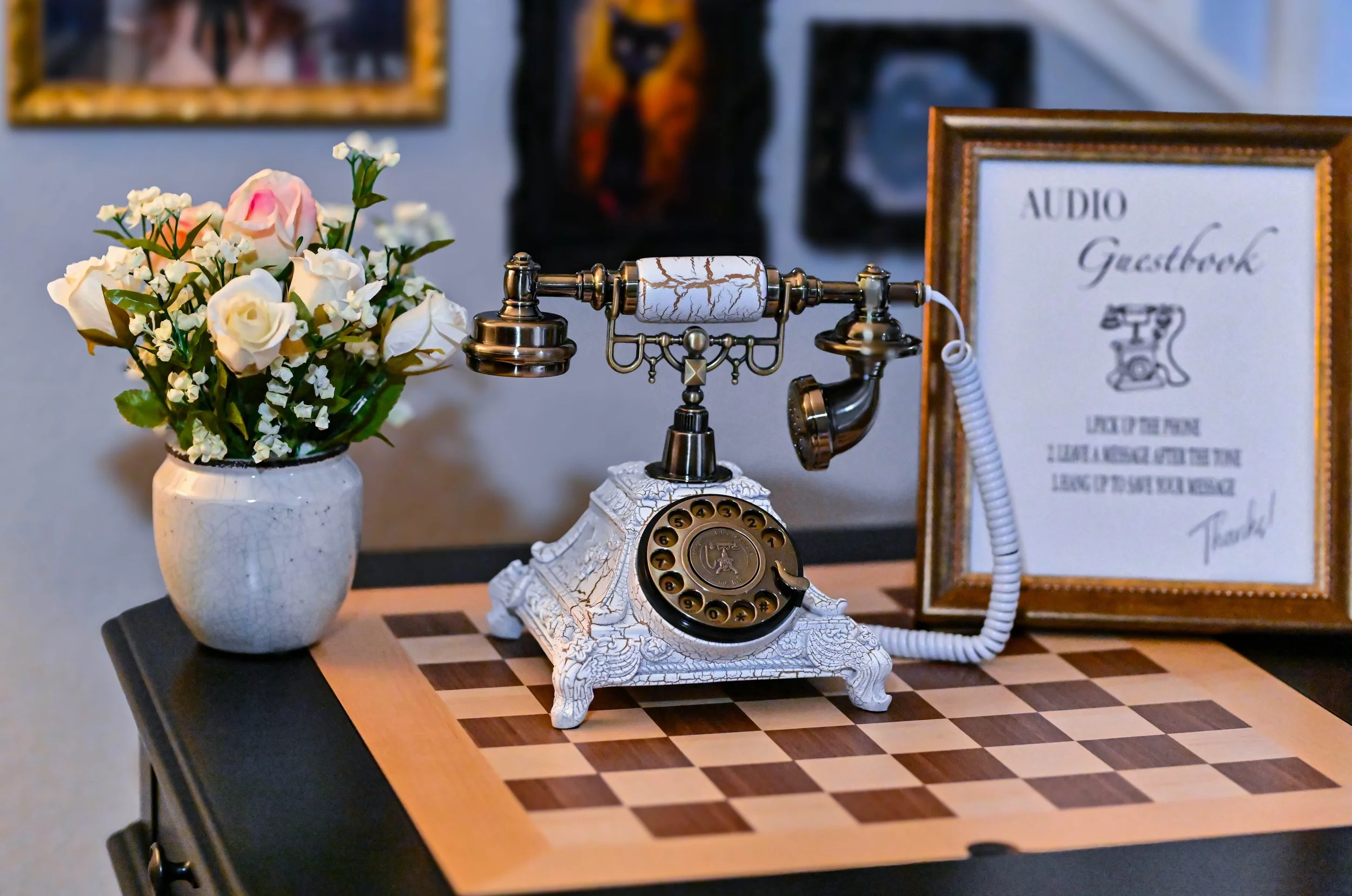 Our vintage-style audio guestbook phone offers a unique and enjoyable way for your guests to leave messages. Just lift the receiver, wait for the beep, speak your piece, and hang up. It's a fun and straightforward method for collecting personal recordings on your special day.